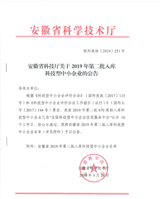 根据《科技型中小企业评价办法》(国科发政[2017]115号)和《科技型中小企业评价工作指引》(国科火字[2017]144号)要求,经过层层筛选和考查,启航彩被安徽省科学技术厅评为“国家科技型中小企业”。