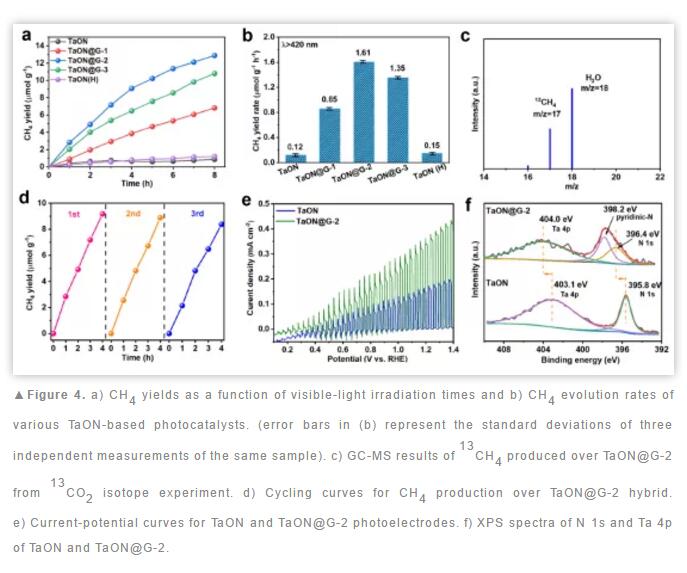 本文通过一种简单而新颖的策略设计合成了TaON@G分层级异质结构,并且其在光催化还原CO2过程中表现出了优异的催化活性。这项工作为合理设计新型半导体/助催化剂光催化体系提供了借鉴,同时为研究石墨烯催化机理和调节催化剂的电子性质来实现高效CO2还原提供了新的理论和实验支撑。