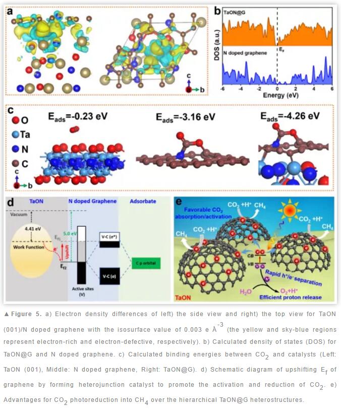 利用太阳能将CO2转化成高附加值的碳氢燃料,是缓解能源危机并减轻温室效应的有效方法。发展高性能光催化剂是光催化还原CO2技术走向实用化的基本前提。新型氧氮化物与对应氧化物相比具有更宽的光谱响应范围以及增强的导电性,特别是TaON、Ta3N5、LaTiO2N 由于其较高的载流子迁移速率且导、价带能级满足还原CO2 和氧化H2O 的热力学要求,近年来广泛应用于光催化领域的研究。对于半导体基光催化, 担载合适的助催化剂构筑半导体/助催化剂结构,不仅可以为CO2 还原提供额外的活性位点并克服 CO2 还原反应的热力学障碍,而且由于能级匹配理论上还可以与半导体复合形成异质结,有助于光生载流子分离,从而大大提高半导体光催化剂的催化反应活性。石墨烯由于其较强的 π-π 共轭作用,拥有出色的 CO2 吸附能力,尤其是氮掺杂石墨烯等,由于氮原子的高电荷和自旋密度,氮原子可以作为吸附中心锚定并活化 CO2 分子,甚至直接参与催化反应,引入石墨烯作为助催化剂为调优光催化 CO2 还原开辟了新的机遇。然而,大多数目标半导体表面通常具有不规则的结构,因此,如何在高曲率半导体表面均匀可控负载石墨烯助催化剂并形成紧密粘附异质界面存在较大的挑战。作者基于化学气相沉积法在TaON颗粒表面实现了原位生长岛状空心氮掺杂石墨烯。所构造的TaON@G光催化剂具有利于电荷分离和转移的异质结界面,利于CO2吸附和活化的中空纳米岛状石墨烯,以及利于诱导氧化还原半反应空间分离的分层次结构。理论计算发现,高功函石墨烯作为强电子受体与n型半导体TaON耦合能快速抽取TaON中的电子,使得石墨烯表面的局部电子密度增加,费米能级提升。通常电子向CO2 反键轨道高效注入被认为是CO2 活化的关键步骤,催化剂表面呈现电子富集态是 CO2 分子活化的重要过程。在 TaON@G 催化CO2 还原过程中,大量的光生电子被富集在岛状石墨烯表面大大增强了石墨烯与CO2之间的相互作用,从而弱化了 CO2中的C=O键,使其活化能垒降低,从而加速了 CO2 还原反应动力学。 最优的 TaON@G 催化剂在CO2-H2O气-固体系中表现出优异的光催化 CO2 全还原活性,其 CO2 至 CH4 的产率超过大多数目前报道的 Ta 基 (氧) 氮化合物。