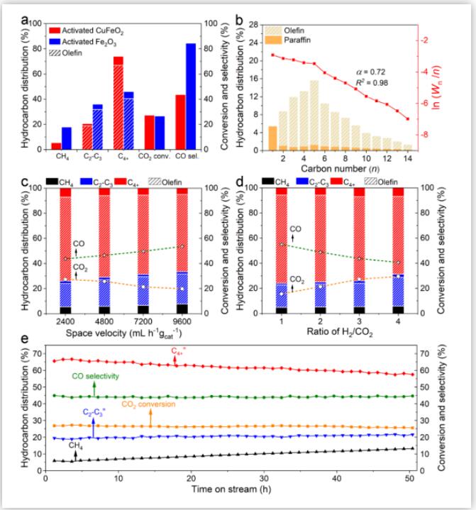 在催化剂合成的时候,先通过共沉淀结合水热法制备铜铁矿结构的CuFeO2,然后在氢气中还原随后在反应气中预处理,最终得到了活化后的催化剂,并命名为活化的CuFeO2。对催化剂进行性能评估发现在320 oC,1 bar(H2:CO2 = 3:1),空速为2400 mL h-1 gcat-1的反应条件下,该催化剂对C4+=选择性高达66.9%,同时CO2转化率为27.3%,CO选择性为43.7%。该C4+=选择性与目前文献报道的高压反应条件下的最优值基本相当。对比于传统铁基催化剂,该催化剂对CO的选择性更低,对C4+=的选择性更高。为了评价催化剂的适用性,我们改变了反应空速和H2/CO2的比值,结果显示催化剂能够适用于广泛的反应条件。进一步研究活化的CuFeO2的催化稳定性时发现,在反应50 h后,CO2转化率基本保持稳定,但是长链烯烃的选择性下降至57.6%,与此同时甲烷的选择性逐渐提高到14.6%。这表明催化剂在常压CO2加氢过程中会逐渐失活。