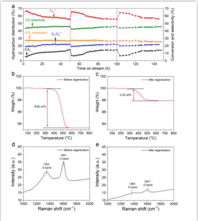 实验中我们发现可以通过简单的提高压力操作让催化剂再生。即在反应进行50 h后,将反应气总压力升至30 bar,并保持4 h,然后再降回1 bar,这时C4+=选择性就能够恢复至65.2%。我们进行了多次再生操作,催化剂每次都能恢复C4+=的高选择性。为了探究再生机制,我们进行了热重和拉曼光谱分析。N2气氛中的热重结果显示再生前催化剂的失重为6.62 wt%,而再生后催化剂的失重为2.02 wt%。拉曼光谱也显示再生后的催化剂表面的无序碳和石墨碳含量远低于再生前的催化剂。所以我们认为高压处理祛除了表面烃类和碳物种,使活性位点得以重新暴露从而使催化剂恢复了活性。并且,通过元素分析,我们发现失活的催化剂Cu和Fe分相比较严重,而再生后的催化剂Cu和Fe元素重叠部分更多。