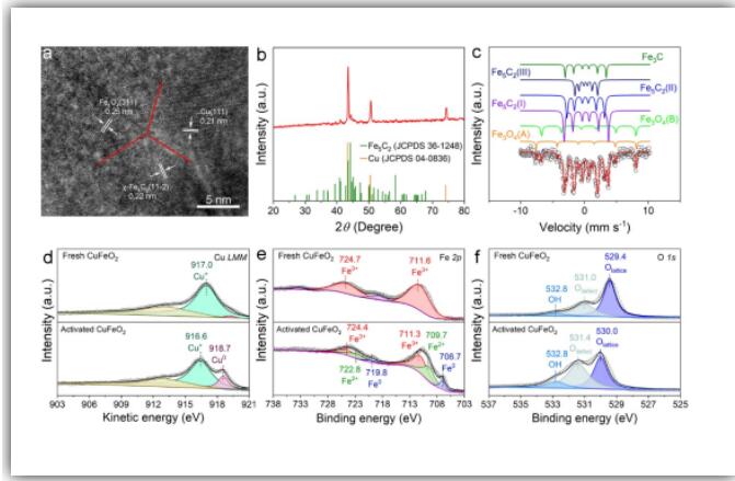 为了深入研究活性位点和物相结构,研究人员对活化的CuFeO2进行了多种结构表征。高分辨电镜观测到了Cu(111)、Fe3O4(311)和χ-Fe5C2(11-2)三种晶面,并能观察到明显的晶面交界。XRD谱的特征峰被归属于金属Cu和χ-Fe5C2,为了进一步厘清Fe的物相,我们进行了穆斯堡尔谱的表征,其结果显示铁的物相包括Fe3O4、χ-Fe5C2和Fe3C,它们的比例分别为16.6%、73.6%和9.8%。XPS表征得到的元素价态结果基本和物相结论相符。