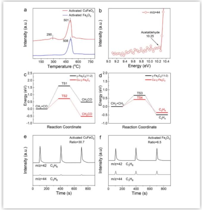 为了探索在常压下C4+=烯烃高选择性的原因,我们进行了原位表征和理论计算相结合的方法来研究内在机制。CO-TPD实验证明了活化的CuFeO2存在CO非解离吸附和解离吸附两种活性位点,说明可能存在CO插入机制。同步辐射真空紫外光电离飞行时间质谱检测到微量含氧产物乙醛,也侧面印证了CO插入机制的存在。理论计算的结果表明在Cu-χ-Fe5C2界面处发生CO插入的反应能垒远低于单独的Fe5C2,并且其CH2偶联的反应能垒也低于单独的Fe5C2。丙烯脉冲的实验表明对比与普通铁基催化剂,界面催化剂对烯烃的二次吸附和加氢能力都很弱导致了产物的高烯烷比。