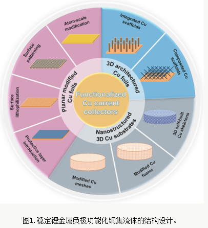 基于功能化铜集流体的设计理念和工作机制,本文系统性综述了近年来功能化铜集流体在长循环、无枝晶锂金属负极开发中的研究进展。首先,对锂金属电池失效的关键因素和挑战进行了详细梳理,阐明了铜集流体改性的必要性以及亟待解决的主要问题。随后,从铜集流体的结构化设计角度将其功能化策略分为三类(图1),包括: