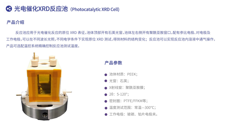 光电催化xrd反应池应用于光电催化反应的原位 XRD 表征,池体顶部开有石英光窗,池体左右侧开有聚肤亚胺窗口,配有参比电极、对电极及工作电极,可以在不同该长光照,不同电学条件下实现原位 XRD测试,得到材料的结构变化;反应池可以实现反应池内溶液中通气操作,产品可选温控系统精确控制反应池测试温度。