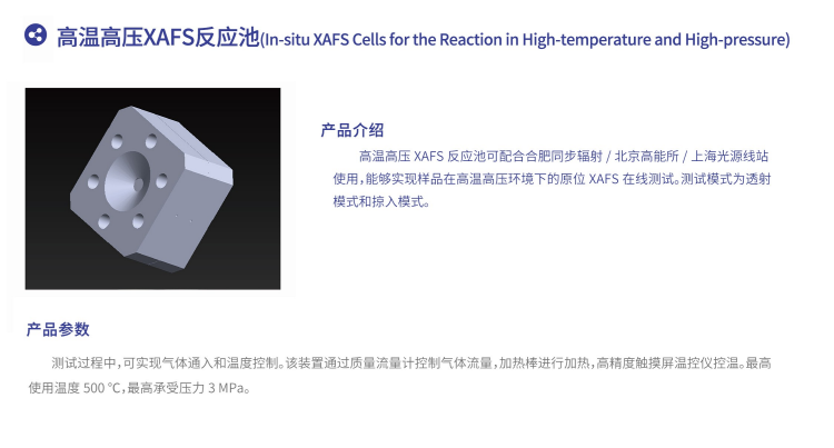 高温高压XAFS反应池可配合合肥同步辐射,北京高能所,上海光源线站使用,能够实现样品在高温高压环境下的原位XAFS在线测试,测试模式为透射模式和掠入模式。