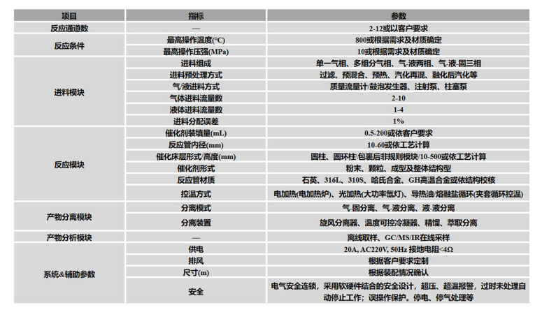 模块化:桌面小型模块化,根据实验体系自由组装、扩展及改进; 精确性:压力±0.25%F.S,流量± 1%F.S,恒温区温差±1°C,各通道间温差±1°C,控温精度±0.1°C; 适用性:可实现多气相、气-液两相和气-液-固三相反应,并能与GC/MS/IR等联用实现在线检测; 便捷性:温度采用PID控制,确保反应温度稳定,可恒定输出以考察反应热量变化。数据采集及控制集成在触摸屏,操作界面简洁友好,使用方便快捷。可实现产物自动取样分析,实现全天候连续运转,无须人工干预; 安全性:电气安全连锁,采用软硬件结合的安全设计,超压、超温 报警,过时未处理自动停止工作;误操作保护;停电、停气处理等。