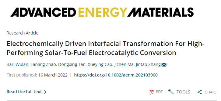 Wulan, B., Zhao, L., Tan, D., Cao, X., Ma, J., Zhang, J., Electrochemically Driven Interfacial Transformation For High-Performing Solar-To-Fuel Electrocatalytic Conversion. Adv. Energy Mater. 2022, 2103960.