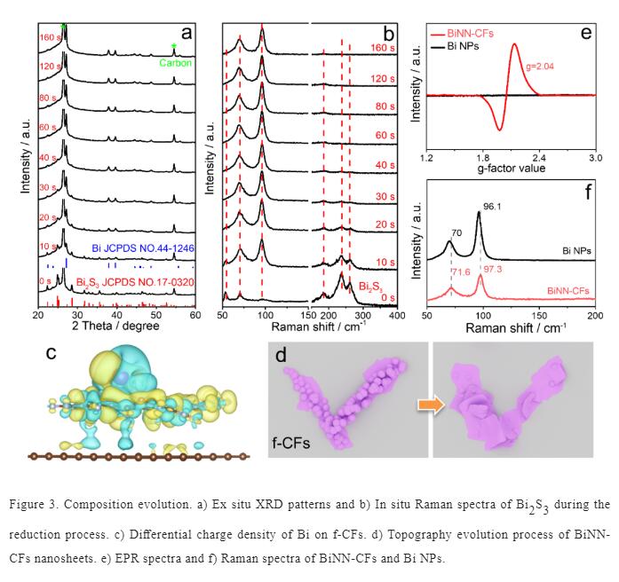 为了探究电化学转变过程,我们利用半原位XRD,SEM,原位Raman等手段进行了结构和组分的追踪。如图3所示,在施加电位的最初几秒,材料由硫化铋迅速转变为金属铋。随后,在f-CFs表面经过相对缓慢的重构过程,组装为相互交联的铋纳米片结构。理论计算结果表明,f-CFs表面对金属铋具有较高的结合能,电荷离域诱导金属铋在f-CFs表面的重构生长过程。