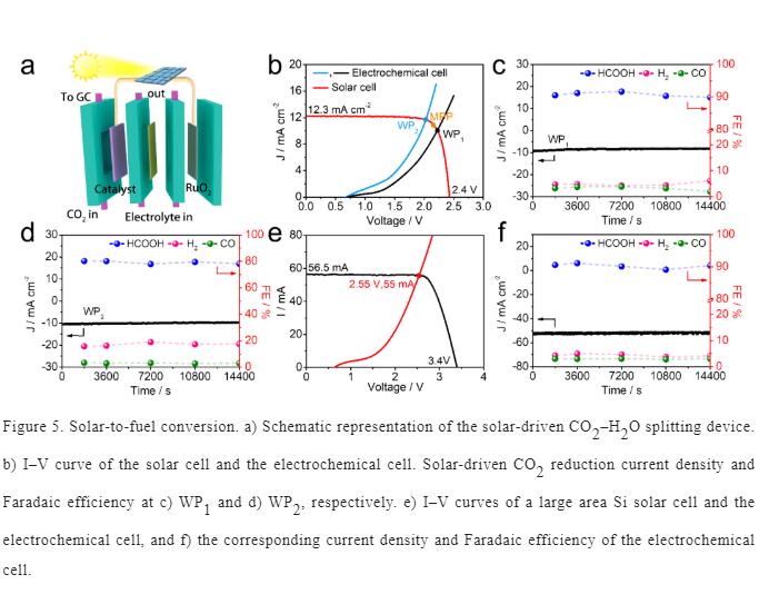 在流动池中CO2RR性能测试表明,在-0.9V时,BiNN-CFs 的甲酸法拉第效率FEHCOOH达到95.7%,在-0.5 ~-1.4 V的超宽电位区间内,FEHCOOH依然维持在92%以上。在-1.3 V时,电流密度高达400 mA cm-2。特别地,通过优化催化剂的载量,使其与太阳能电池的最大功率点匹配,实现了优异的太阳能到甲酸的转化率13.8%和高的太阳能到电能的利用率55.6%。