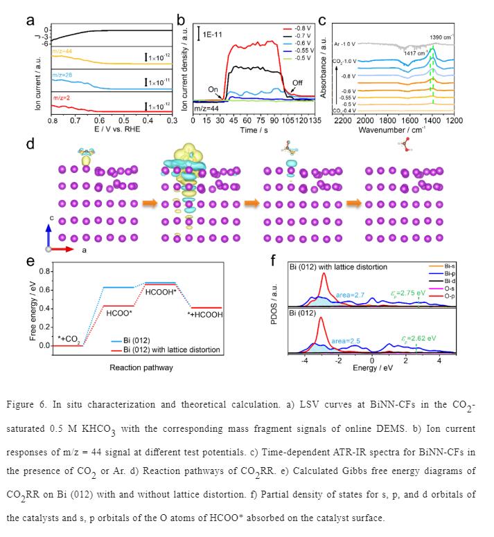 利用微分电化学质谱揭示CO2RR过程中产物与电位之间的关系,同时利用原位红外进一步识别关键的反应中间体HCOO*。理论计算结果表明,具有晶格扭曲的Bi(012)对HCOO*具有更高的吸附能,能够显著降低反应的吉布斯自由能,促进CO2的吸附和活化,从而实现高效电还原CO2。